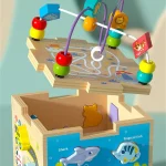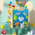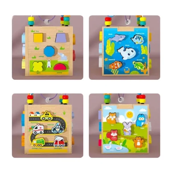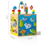 Jucarie Montessori Cub Activitati Animalute Marine are multiple activitati incluse,precum labirint,sortator,puzzle,etc.