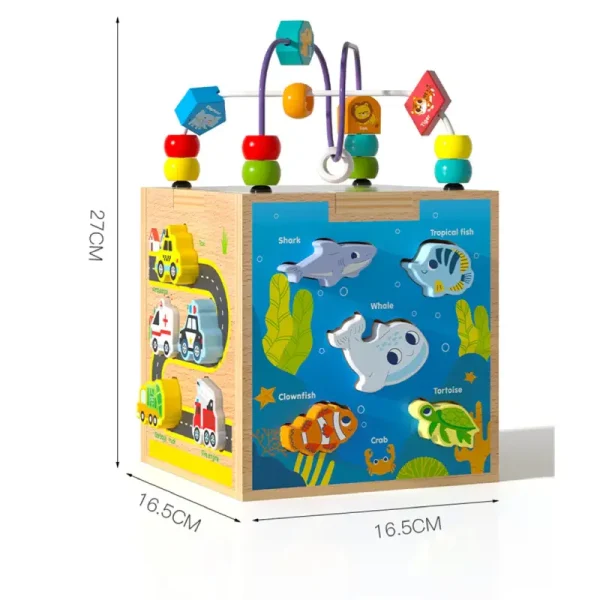 - Învățare despre animale marine: Cubul cu activitati poate servi ca un instrument educațional pentru a învăța despre lumea marină, inclusiv pești, delfini, stele de mare și altele. Acest lucru încurajează dezvoltarea cunoștințelor generale.