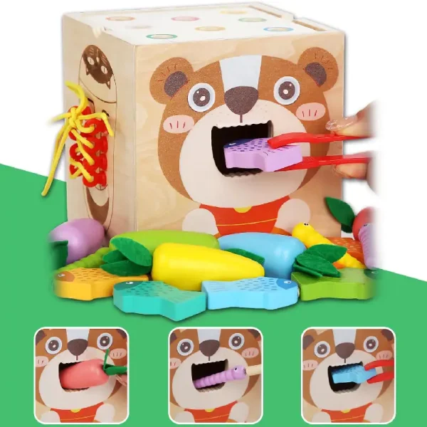 Utilizarea pensetelor pentru a hrăni ursulețul cu diferite forme îi ajută pe cei mici să-și dezvolte precizia și răbdarea, în timp ce activitățile de potrivire și sortare îmbunătățesc recunoașterea formelor și culorilor.