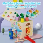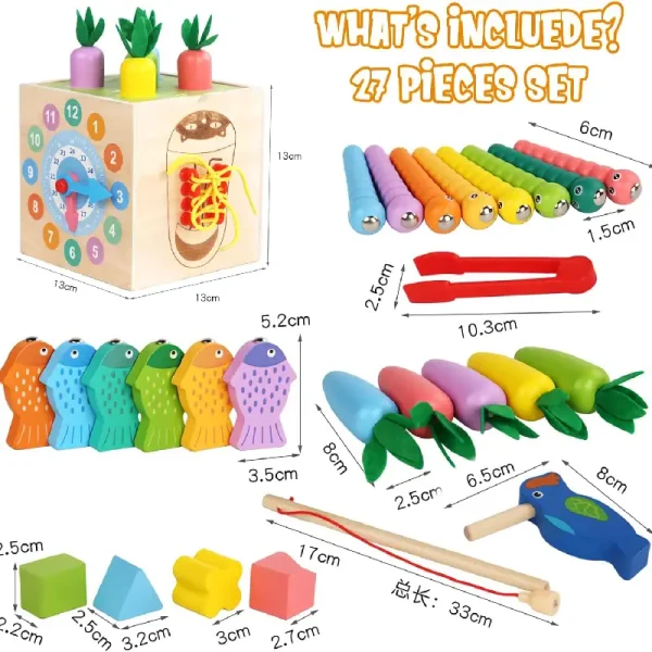 Pe fiecare latură a cubului, copiii vor descoperi diferite activități: de la jocuri de tip puzzle și forme de potrivit, până la șireturi de tras și jocuri de pescuit cu forme de alimente colorate, precum pești, legume și viermișori.