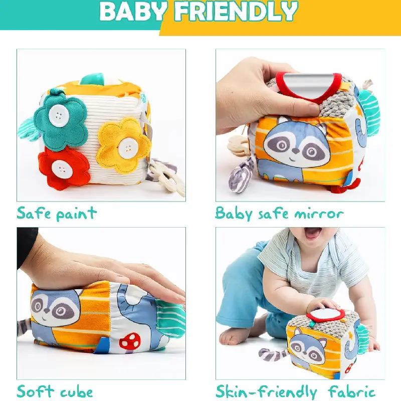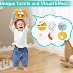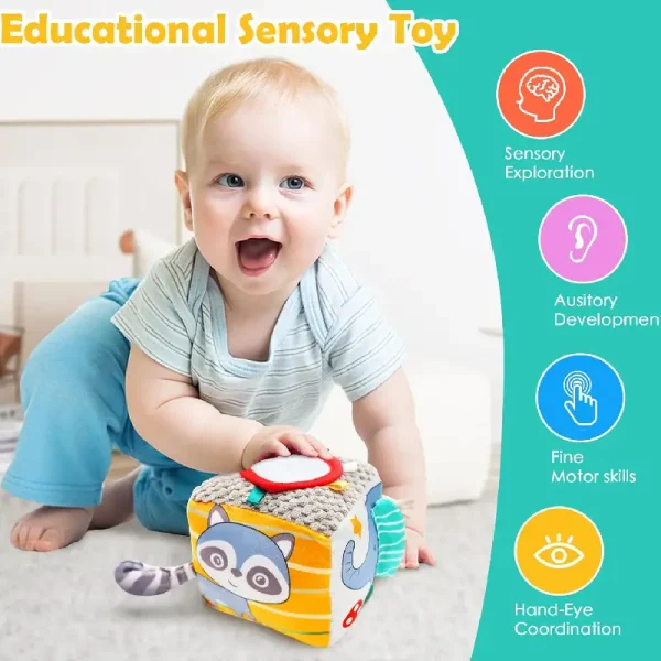 Descoperă o lume a culorilor și a jocului educativ cu Cubul senzorial de pluș pentru bebeluși!