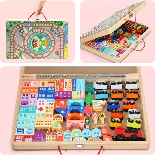 Acest set de cuburi din lemn oferă copiilor posibilitatea de a-și dezvolta creativitatea și abilitățile motorii fine în timp ce construiesc propriul lor mic oraș sau lume imaginată.