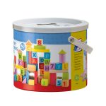 Cuburi din lemn cu litere si numere culori pastelate (60 piese in galeata)