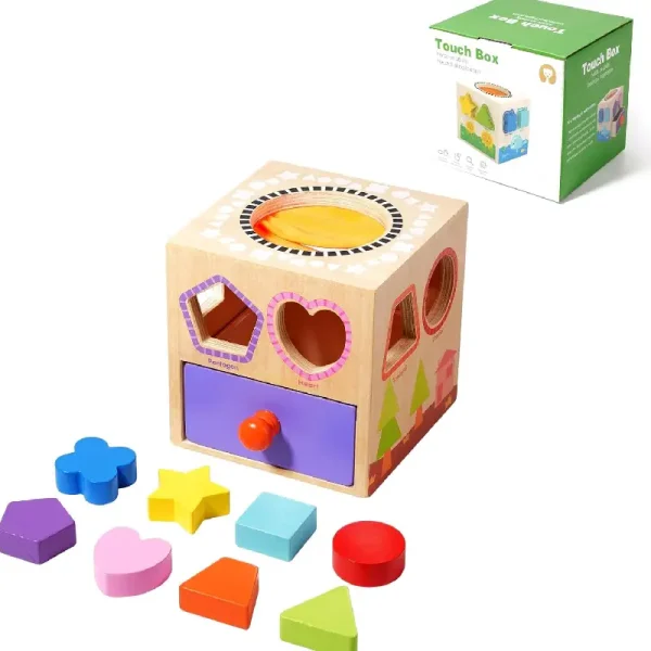 O cutie educativă Montessori cu forme geometrice colorate și texturi unice.