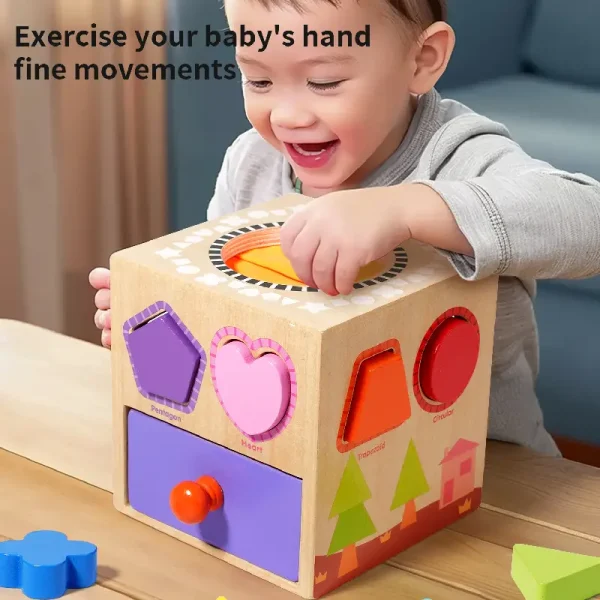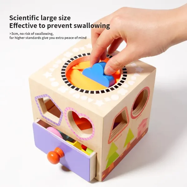 Copilul introduce mânuța înăuntru, fără să vadă, și ghicește ce formă ține în mână. Apoi o potrivește în spațiul corect.
