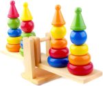 O jucărie educativă din lemn care încurajează dezvoltarea și îmbunătățirea abilităților motrice, gândirea logică și învață copilul să distingă culorile, mărimile și greutățile.