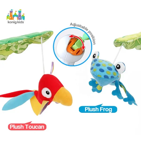 Happy Jungle Jumper vine echipat cu o varietate de jucării interactive și colorate, concepute pentru a captiva atenția bebelușului și a încuraja explorarea și descoperirea. De la jucării care emit sunete amuzante până la elemente tactile, fiecare detaliu este gândit pentru a stimula simțurile și curiozitatea micuțului tău.