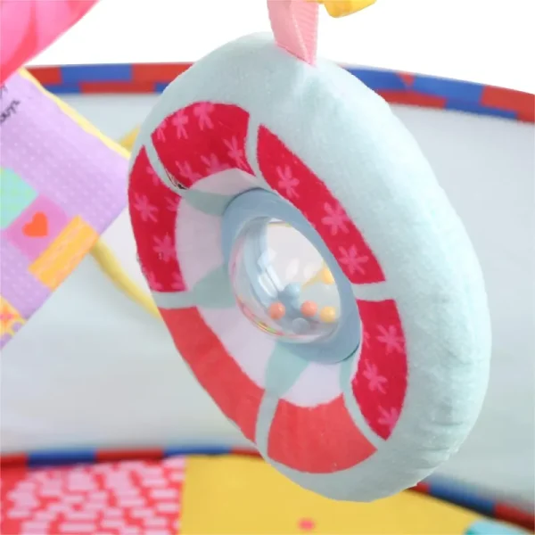 - Jucării suspendate: Centrul de activități are jucării suspendate pe cele doua arcade, astfel bebelusii să le poată atinge și să le lovească cu mâinile sau picioarele.