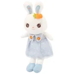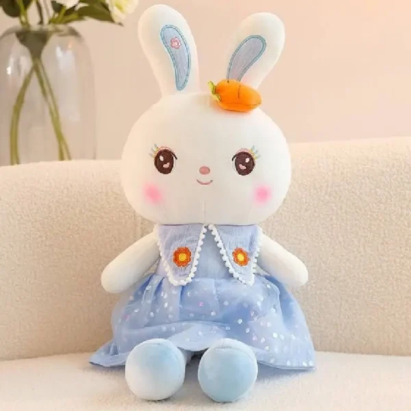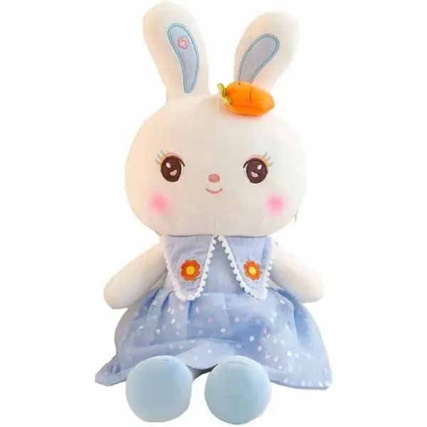 Descoperă farmecul inconfundabil al iepurașului de pluș gigant cu rochiță bleu și morcov decorativ, creat pentru a aduce zâmbete și căldură în suflet.