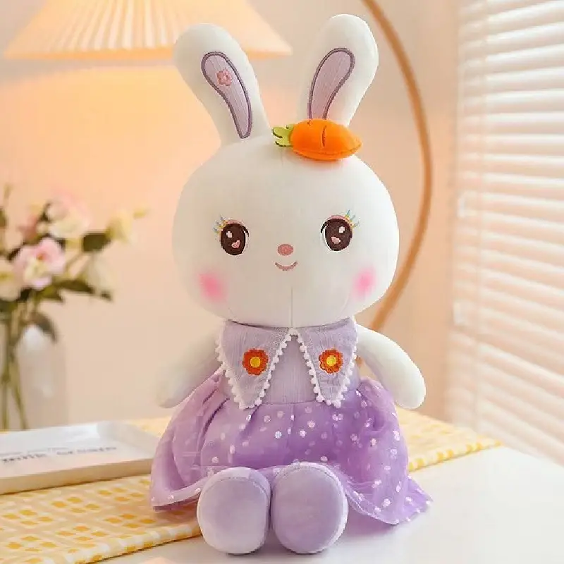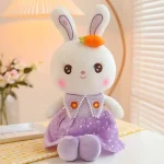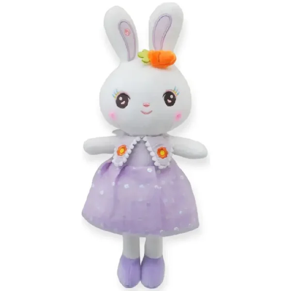 Descoperă farmecul inconfundabil al iepurașului de pluș gigant cu rochiță mov și morcov decorativ, creat pentru a aduce zâmbete și căldură în suflet.