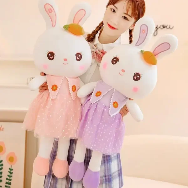 Descoperă farmecul inconfundabil al iepurașului de pluș gigant cu rochiță mov și morcov decorativ, creat pentru a aduce zâmbete și căldură în suflet.