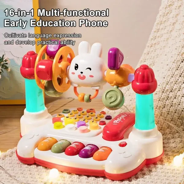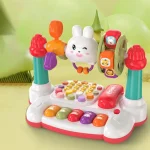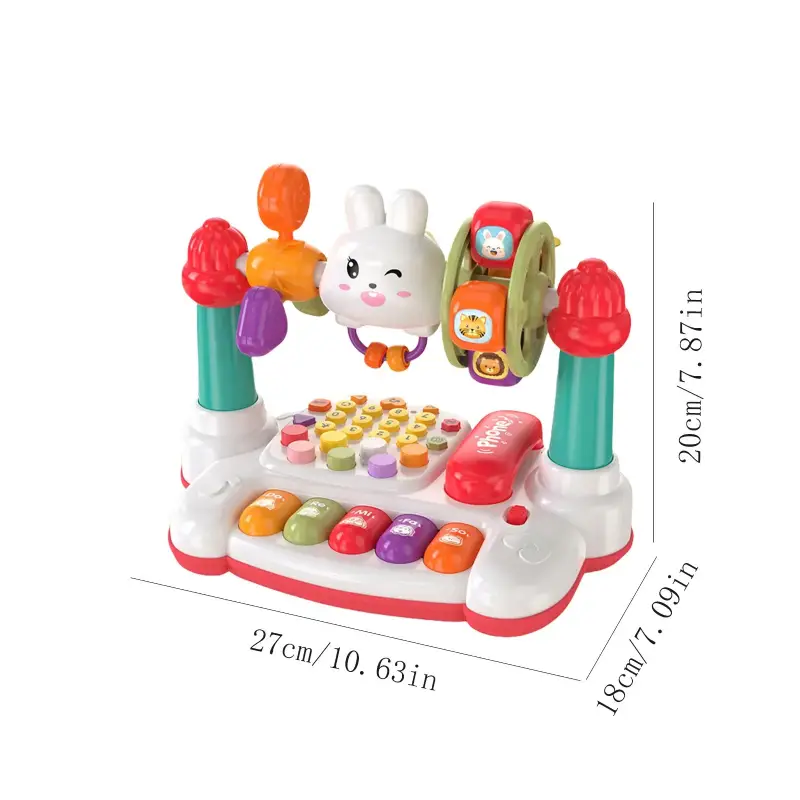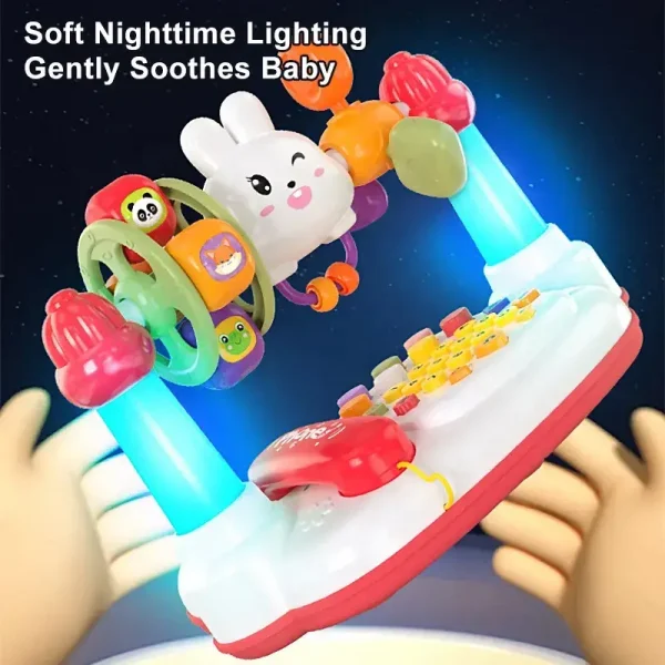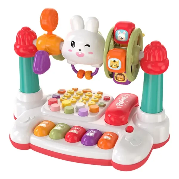 Echipată cu butoane colorate ce scot sunete muzicale, un iepuraș drăguț care se mișcă și alte elemente rotative, această jucărie stimulează dezvoltarea simțurilor, abilitățile motorii fine și coordonarea mână-ochi.