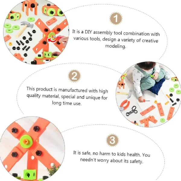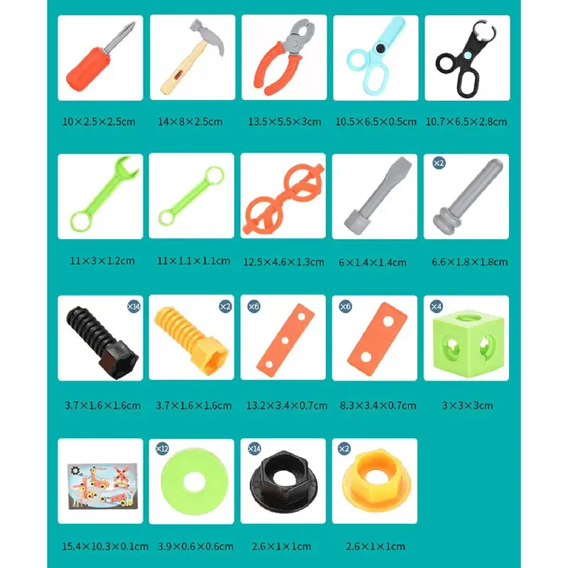 Cu acest set complet de unelte și piese, copilul tău intră într-o lume unde imaginația prinde formă, șurub cu șurub, piuliță cu piuliță. Fiecare element este conceput special pentru mâini mici și curioase, astfel încât joaca să fie sigură, ușoară și plină de satisfacție.