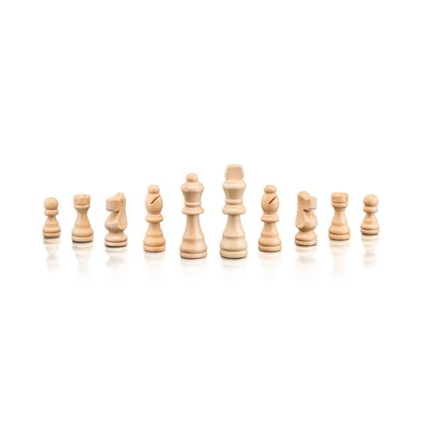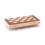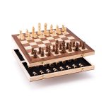 Design luxos de sah intr-o cutie practica de lemn. Tabla de sah este prelucrata ca o incrustatie de doua culori de lemn. Figurile sunt plasate in interior dupa ce jocul se termina. Jocul include instructiuni.