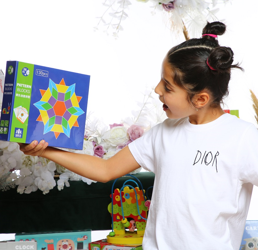 Joc Creativ Tangram Lemn cu 130 de piese este un joc foarte vechi de puzzle. Se pot construi diferite forme ca de exemplu : flori,numere,siluete. Cu ajutorul celor 7 piese : doua triunghiuri mari,un triunghi mediu,doua triunghiuri mici,un patrat si un paralelogram se pot crea peste 350 de modele. Cu ajutorul jocului Tangram ,se dezvolta perceptia,memoria vizuala,coordonarea ochi-mana. Prin aranjarea pieselor jocului se obtine dezvoltarea gandirii logice ,intelegerea conceptului de forma,modelarea matematica,recunoasterea formelor geometrice. Siluetele si formele obtinute pot crea povesti ,starnind imaginatia si pot constitui instrumente in dezvoltarea limbajului copilului. Poate fi jucat impreuna cu parintii sau cu alti copii.