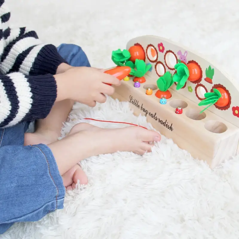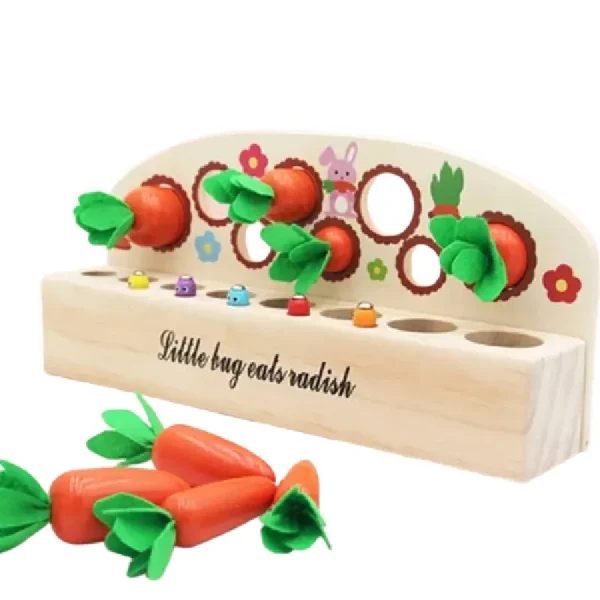 Această jucărie adorabilă din lemn îi ajută pe cei mici să învețe despre forme și culori prin joacă, implicând morcovi și gândăcei colorați.