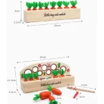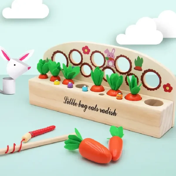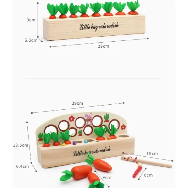 Setul include o bază din lemn decorată cu flori și un iepuraș, alături de morcovi care trebuie potrivite în decupajele corespunzătoare.
