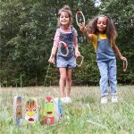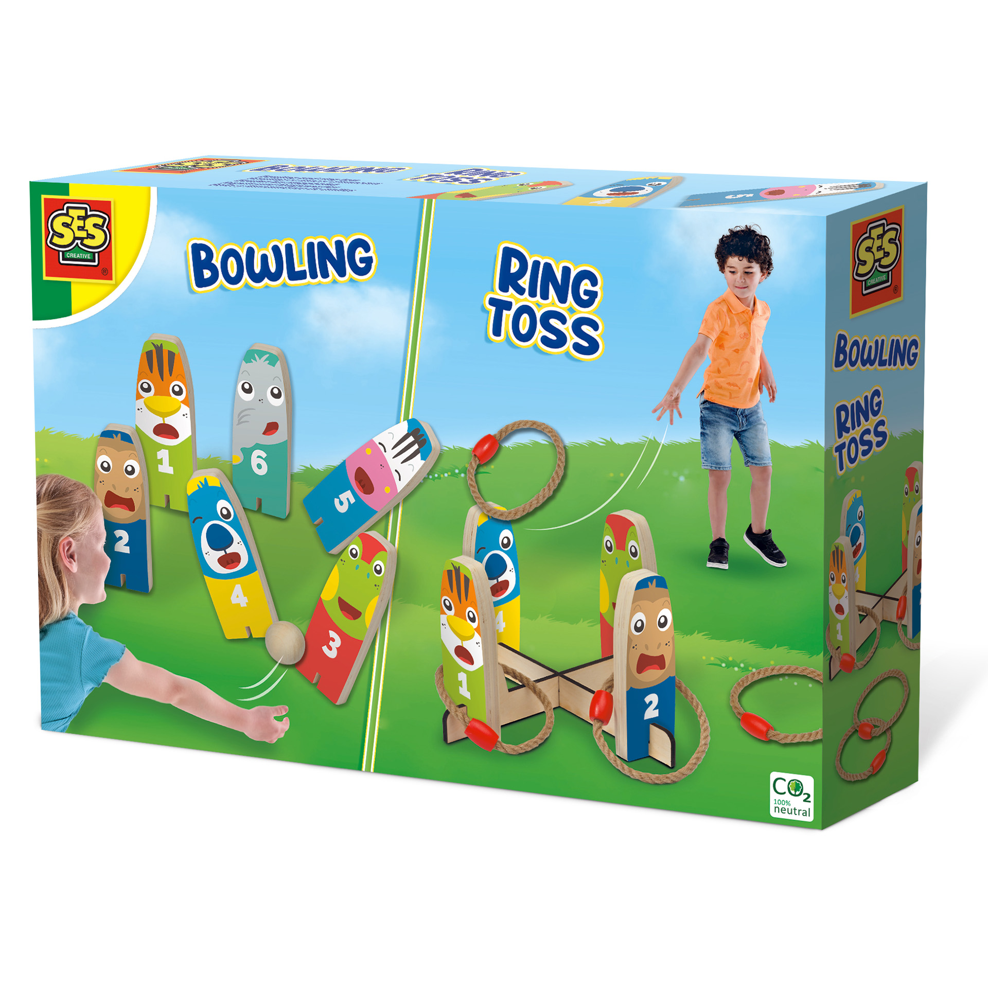 Contine: 6 piese de bowling/ring; 1 bila de lemn Ø40mm; cadru din lemn pentru aruncarea inelului; 4 inele de franghie; geanta de depozitare textila; instructiuni.