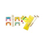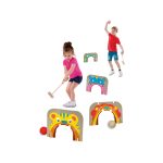 Contine: 4 arcuri de lemn pentru crochet; scanduri de lemn pentru aruncarea sacii de fasole; 2 bete de crocheta din lemn; 2 bile de lemn Ø40mm; 2 saci de fasole; geanta de depozitare textila; instructiuni.