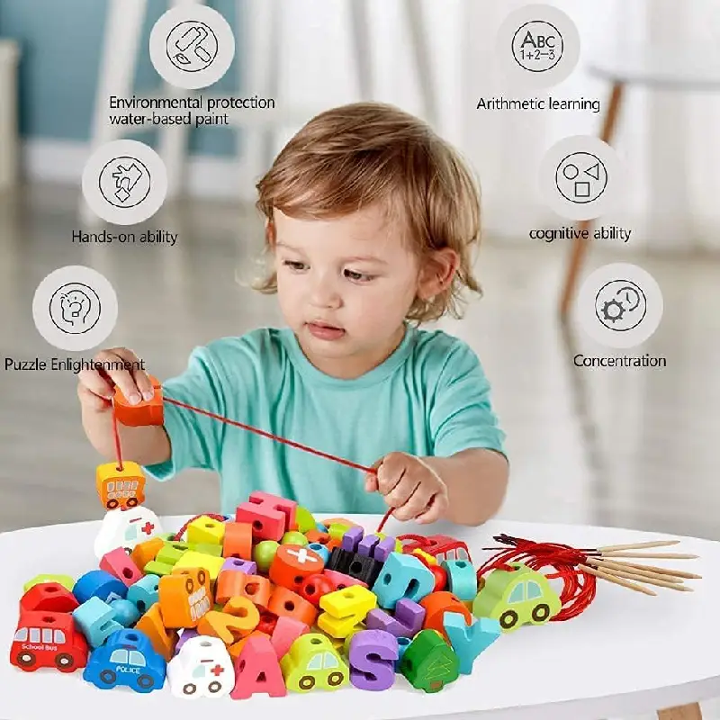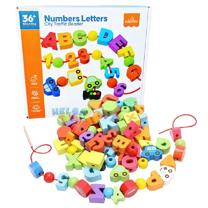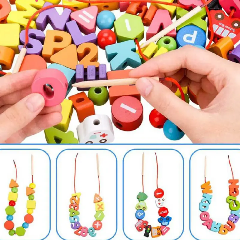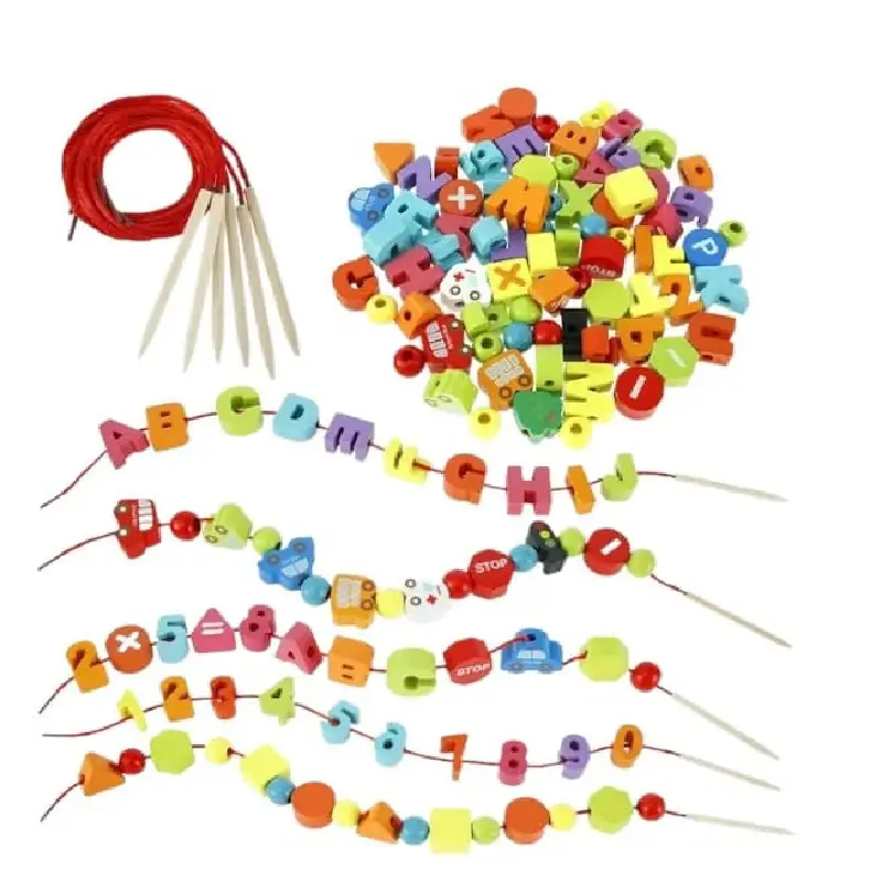 Datorită șnururilor incluse, cei mici își dezvoltă motricitatea fină, coordonarea mână–ochi și răbdarea. Este o jucărie perfectă pentru joaca independentă, dar și pentru activități de familie — construiește șiraguri tematice sau formează nume, cuvinte, exerciții simple și mini-povești.
