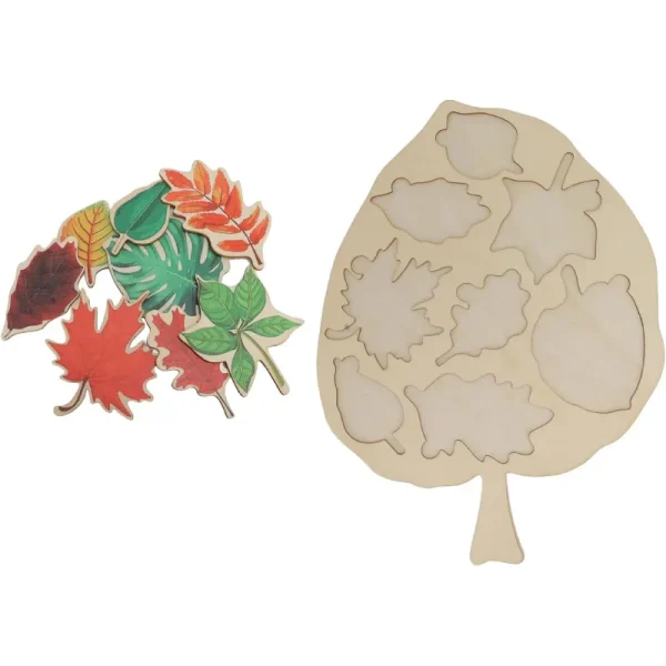- Continut : Baza acestei jucării Montessori este o frunză de lemn cu 8 bucăți din diferite feluri de frunze: plop, arțar, fag, mesteacăn, frasin, stejar, castan și palmier. Designul multicolor este foarte atrăgător și are aspectul real al fiecărui fel de frunză pentru a atrage atenția copiilor.
