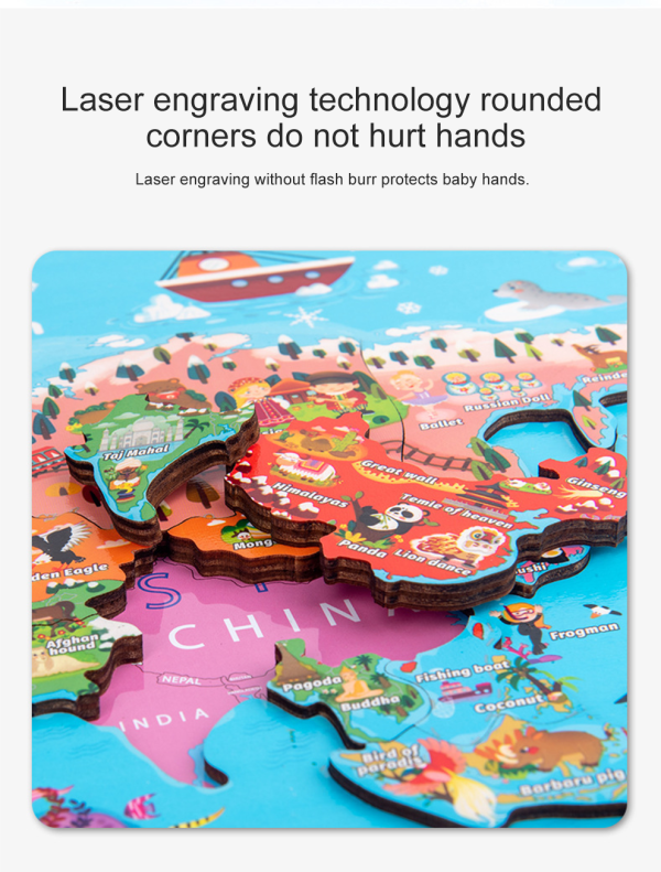 Puzzle-ul din lemn conține 49 de piese, steaguri naționale pe spate, 92 de carduri de geografie națională ce corespund la 184 de țări,2 cleme și un saculet de depozitare.