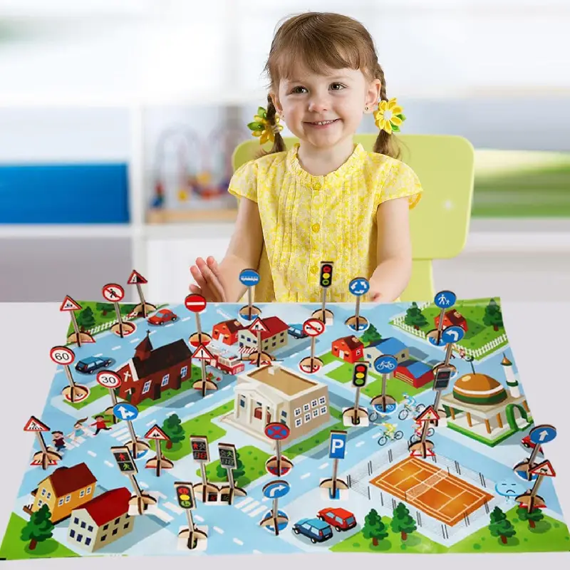 Copiii așază semnele și semafoarele pe planșă și învață să respecte regulile de circulație ca într-un mic oraș în miniatură.