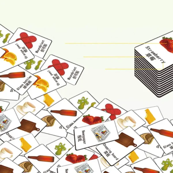 Cardurile cu imagini includ deseuri din bucatarie, deseuri menajere, plastic, hartie, electronice, electrocasnice – articole care pot fi reciclate.