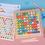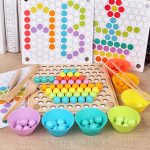 Copilul va folosi unul din sabloane pe care va aplica suportul cu gaurele. Apoi cu una din ustnsilele din lemn va lua o biluta si o va pune pe suport in dreptul culorii corespondente.