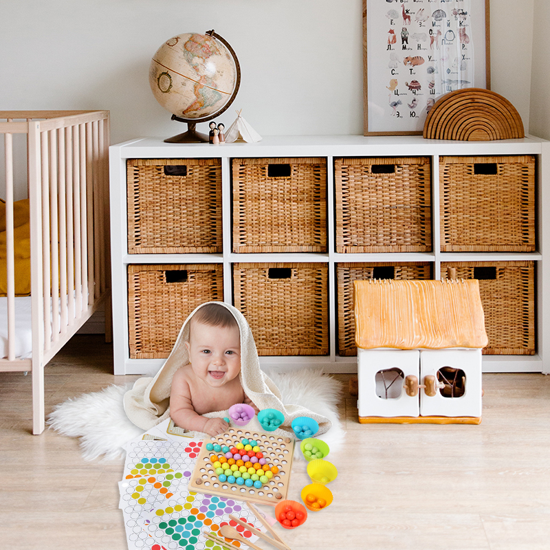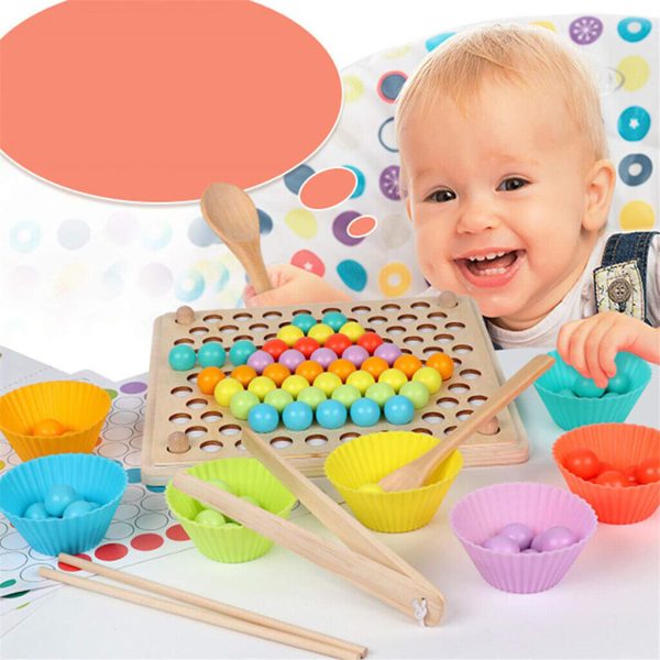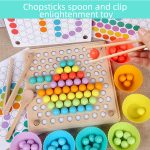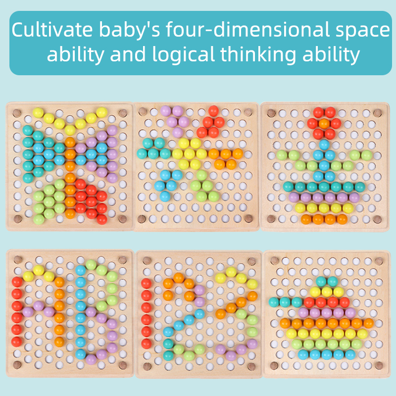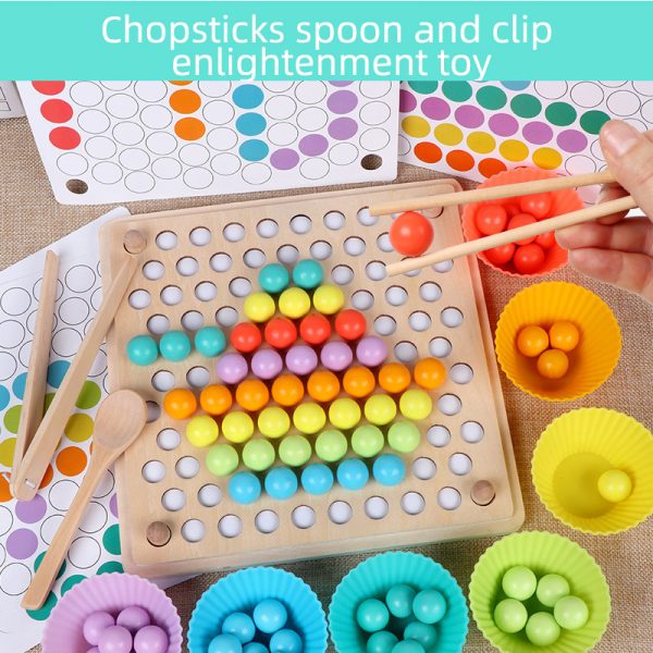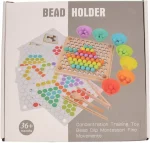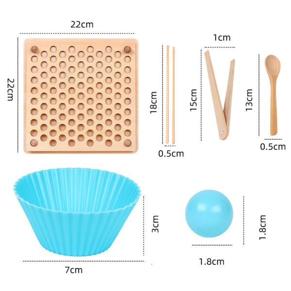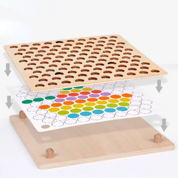 Jocul este confectionat din lemn si are un suport special pe care se fixeaza plansele cu ilustratii. Cu ajutorul pensetei sau a betelor chinezesti,se prind bilele colorate si se aseaza pe suportul cu gaurele in functie de ceea ce este afisat pe plansa.