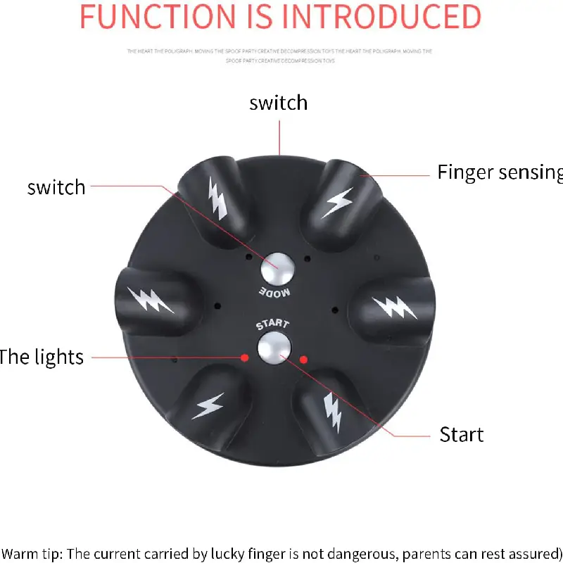 - Lucky Mode – În acest mod, jucătorii introduc degetele în locurile destinate de pe dispozitiv, iar acesta va selecta aleatoriu un jucător care va primi un mic șoc electric.