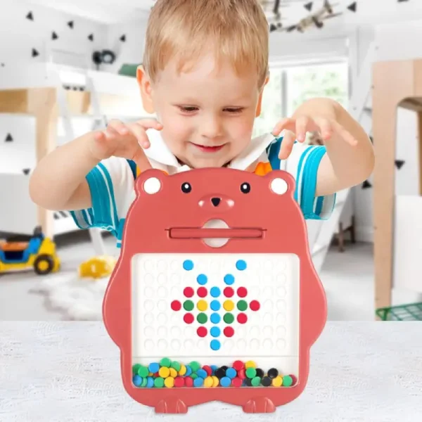 Copiii folosesc stiloul magnetic pentru a muta bilele colorate și a completa modele ilustrate – inimioare, flori, stele, animale și multe altele. Fiecare reușită e o mică victorie care le oferă încredere și bucurie!