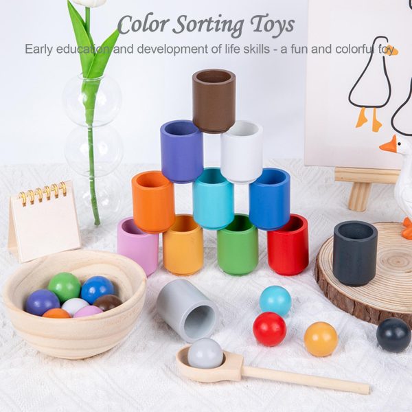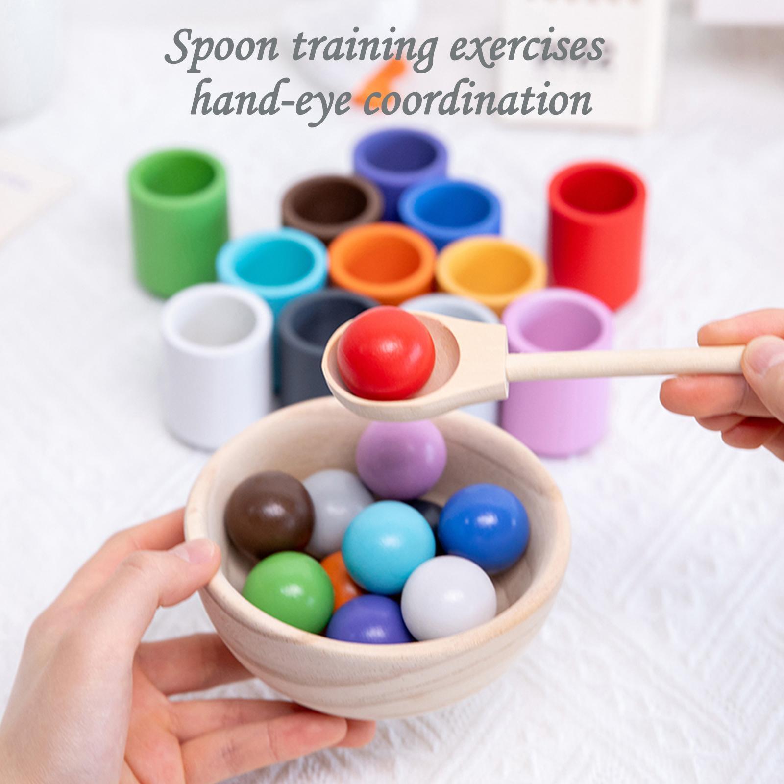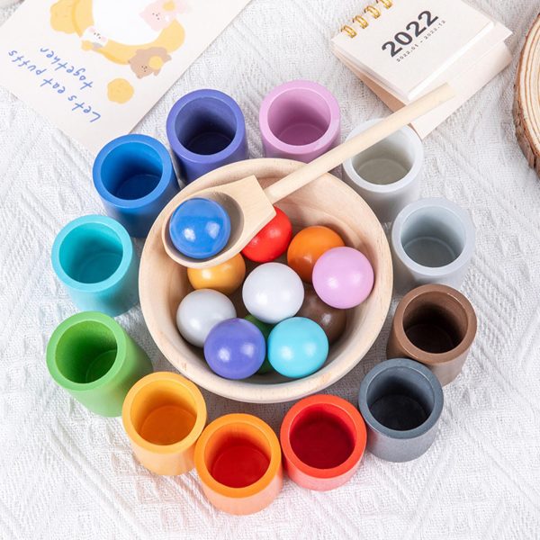 Jocul de asociere si sortare bile din lemn curcubeu contine : 12 bile colorate,12 cupe de aceleasi culori,o lingura din lemn si un bol din lemn.