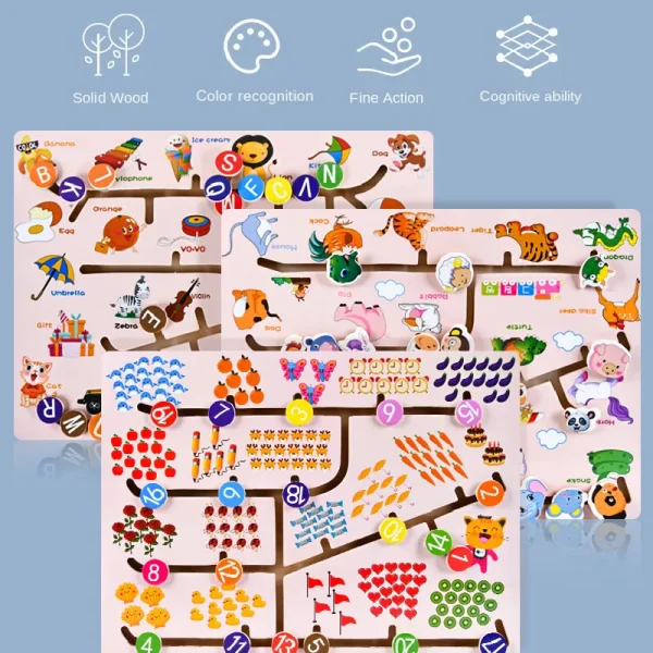 Un joc Montessori educațional cu labirint și animale din lemn este o jucărie și o baza educațională care promovează dezvoltarea abilităților cognitive și motorii la copii.