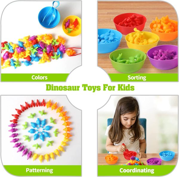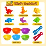 Jocul de sortare și numărare Montessori include 48 de dinozauri, 6 boluri, 2 cleme și o recipient de depozitare din plastic.