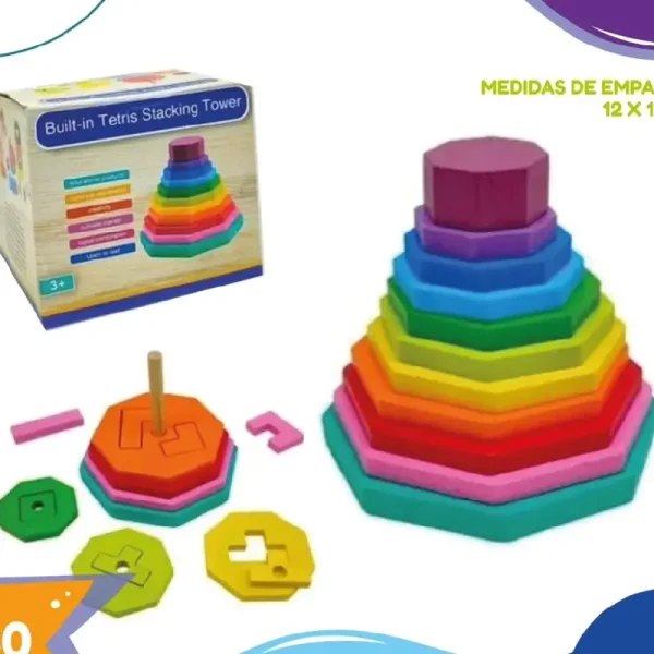 Acest turn colorat are o tija pe care se stivuiesc patratele din lemn.