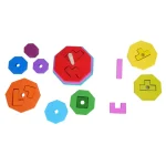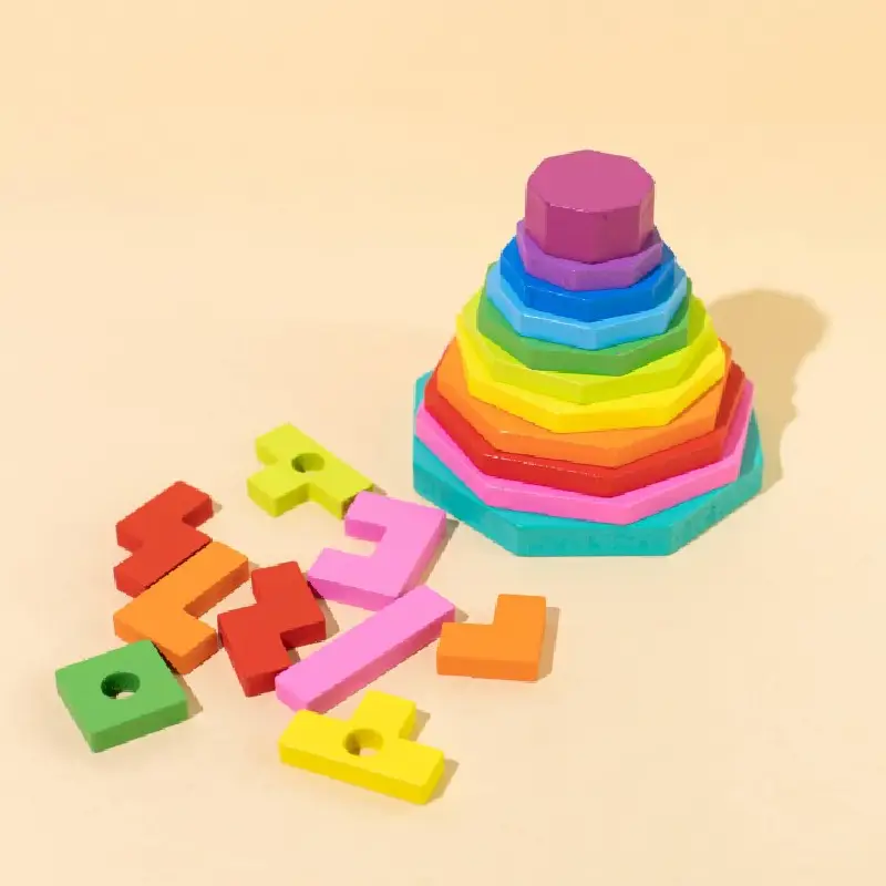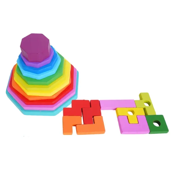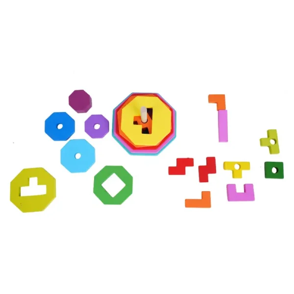 Copiii trebuie sa plaseze piesele din lemn una peste alta,in ordinea marimilor,insa pot fi si creativi,suprapunandu-le dupa cum doresc.