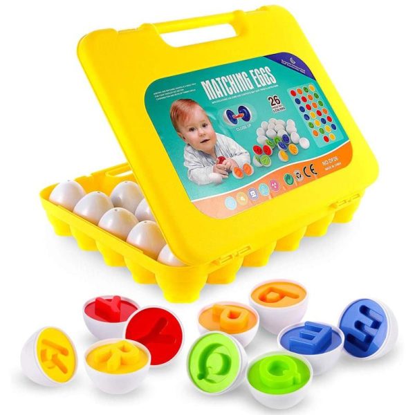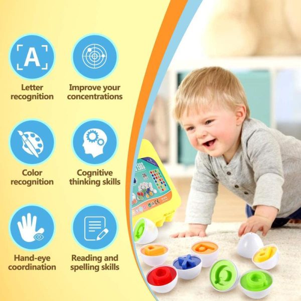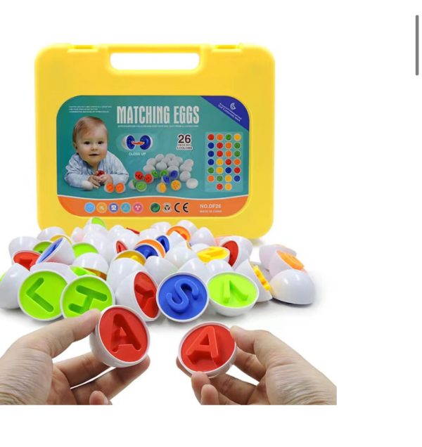 Este alcatuit dintr-o cutie din plastic ABS fara BPA care contine in interior 26 de oua,care la randul lor au in interior literele alfabetului.