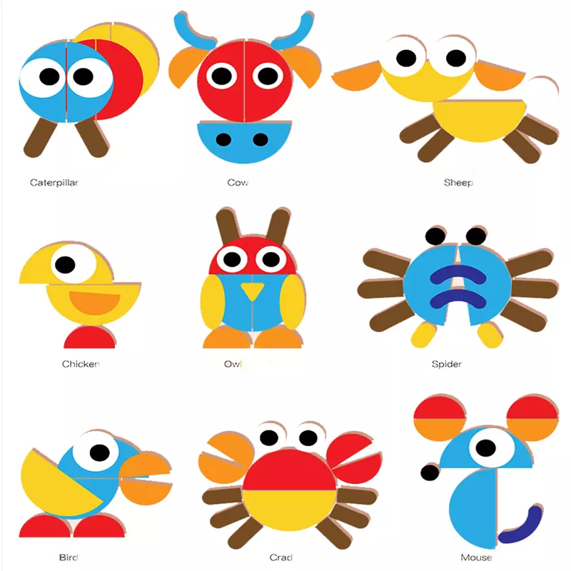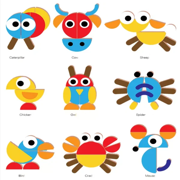Joc Montessori Tangram Lemn Animale Haioase are piese colorate si haioase,este creativ si des utilizat in pedagogia Montessori.