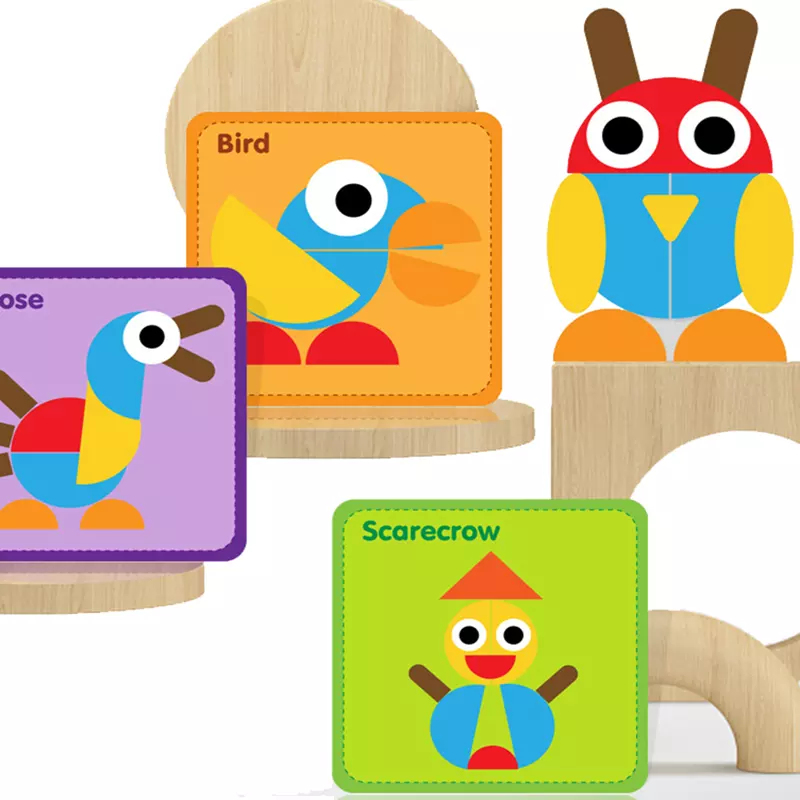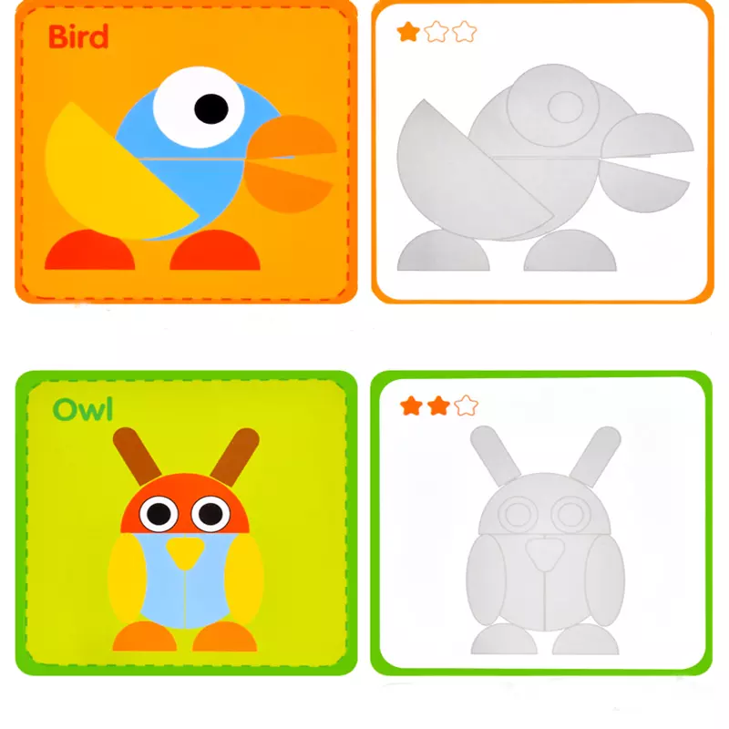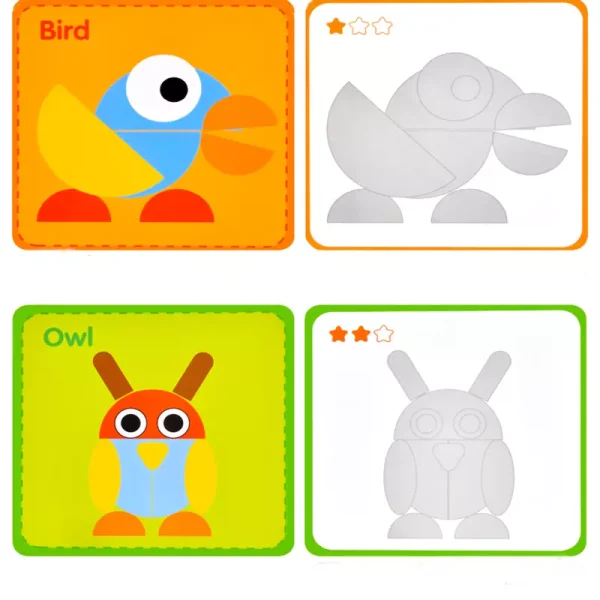 Prin alaturarea pieselor tangram din lemn,cei mici vor putea reproduce imagini de pe cartonase cu animalute haioase.