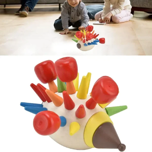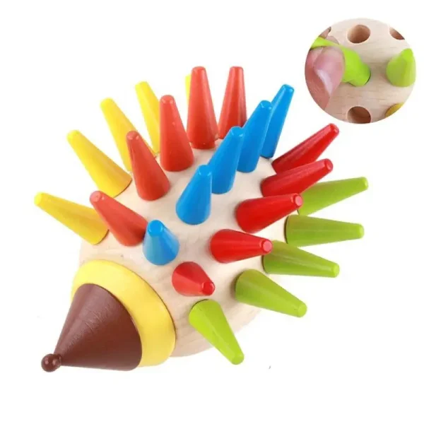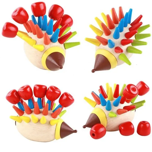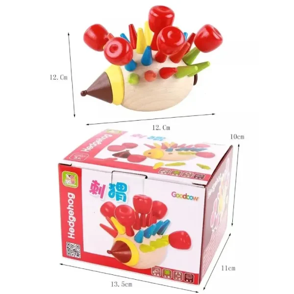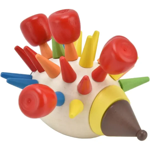 Ariciul din lemn este prevăzut cu orificii de diferite dimensiuni, iar sarcina copilului este de a sorta și de a introduce tepii colorati în aceste orificii.