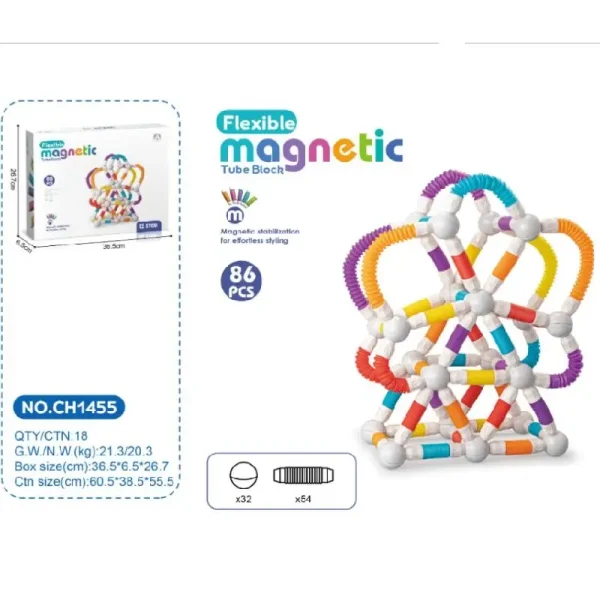 Descoperă setul STEM cu 86 de piese – o jucărie educativă unică, formată din tuburi magnetice flexibile și bile magnetice puternice, concepută pentru a stimula gândirea logică, creativitatea și coordonarea mână-ochi la copii!