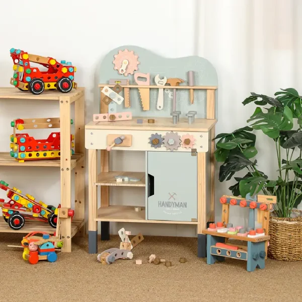 Cu funcționalități interactive, precum ceasul, suportul pentru unelte și sertarul pentru depozitare, acest banc de lucru este alegerea perfectă pentru cadouri sau activități educative.