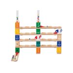 Turn din lemn cu trasee si bile Quadrilla pentru copii (125 piese). Copilului ii va placea sa construiasca turnuri inalte si cai rapide cu aceasta jucarie. Vine cu 30 de carti de provocare, ghidandu-ti micutul prin mai multe proiecte creative si interactive de constructie pentru a construi diferite piste de marmura.