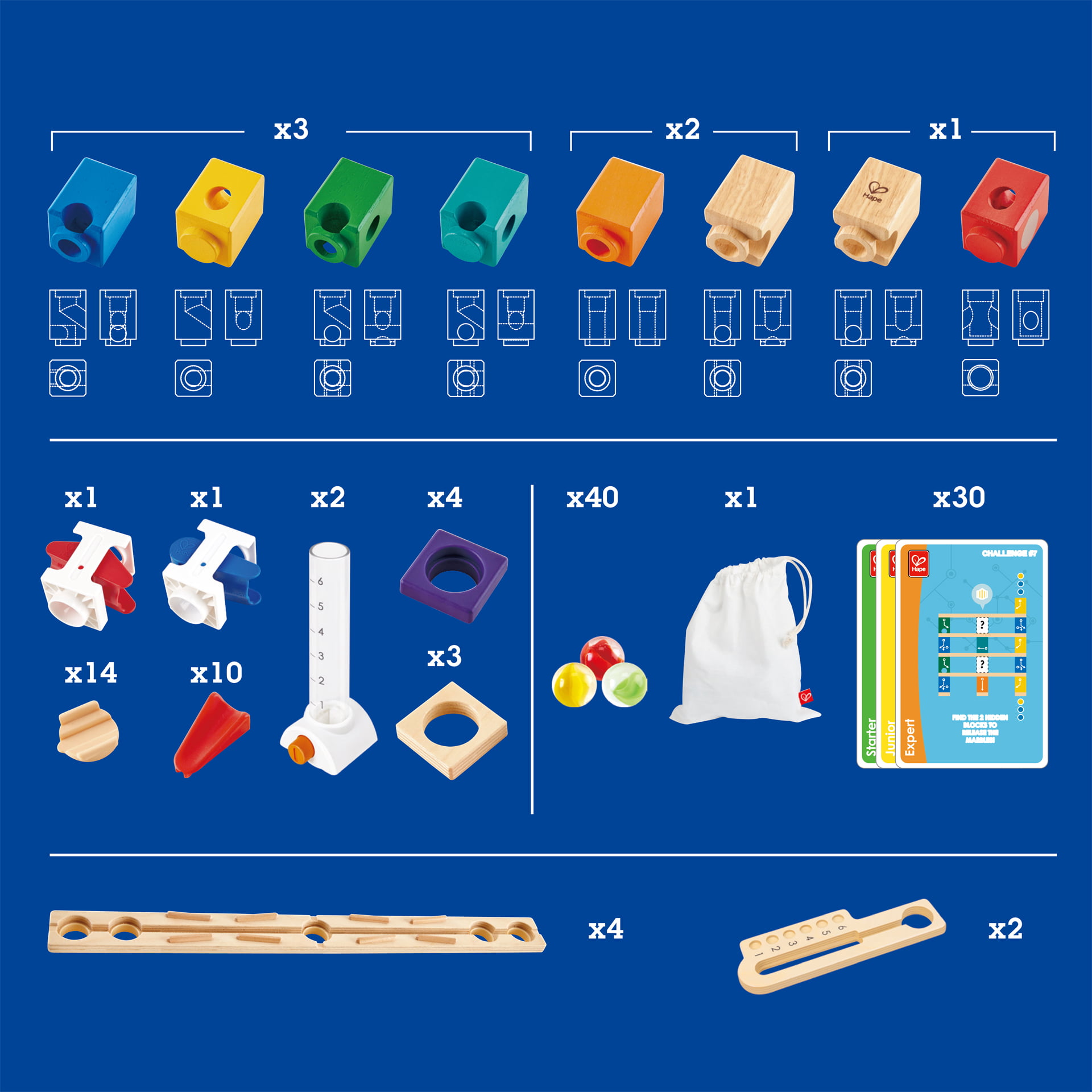 Setul include 40 de bile colorate (cu o punga de bumbac), 18 blocuri, obloane cu 2 gauri, un alimentator de marmura, 10 acceleratoare, 3 inele de escaladare, un balansoar albastru, un balansoar rosu, 2 colectoare de bile, 4 piste lungi drepte, 30 de carti de provocare etc.