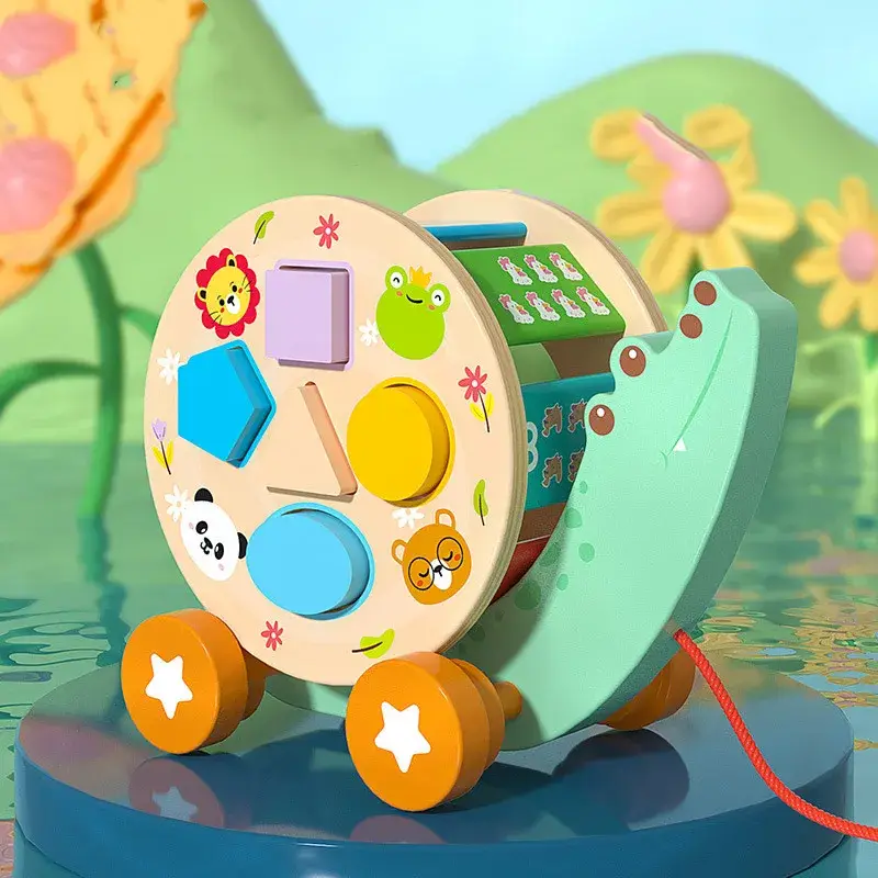 Jucarie de Tras cu Forme Geometrice Crocodil este educativa și distractiva care au scopul de a ajuta copiii să învețe despre forme geometrice și să dezvolte abilități motorii fine.