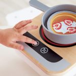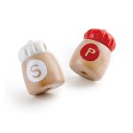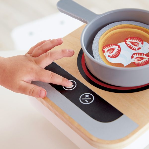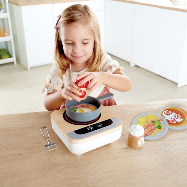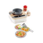 Setul de jucarii din lemn are elemente precum ventilatorul incorporat, care face ca mancarea sa se intoarca in tigaie, sare si piper care se rotesc si se invart atunci cand presarati in tigaie. Doua viteze ale ventilatorului pentru a controla caldura.