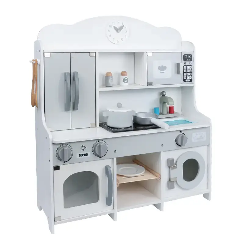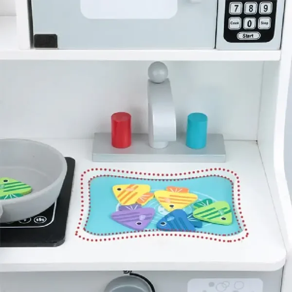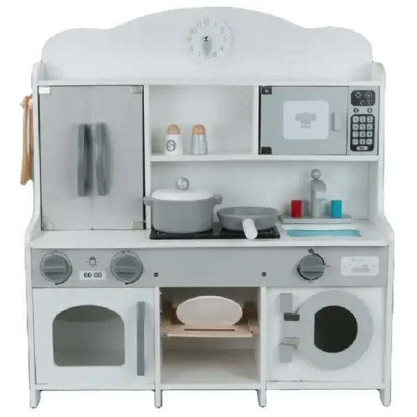 Setul include toate elementele esențiale pentru o bucătărie completă: un cuptor, aragaz cu butoane rotative, chiuvetă detașabilă, dulapuri pentru depozitare, cuptor cu microunde și chiar un ceas decorativ!