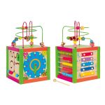 Ajutor didactic, jucarie logica. Excelent pentru dezvoltarea abilitatilor motorii ale copilului. Contine: xilofon cu ciocan, ceas, tejghea, labirint si in partea superioara un labirint cu margele care pot fi miscate de-a lungul structurii de sarma. Dupa ce jocul se termina, partea cu labirint se pliaza spre interior pentru depozitarea usoara a jucariei.