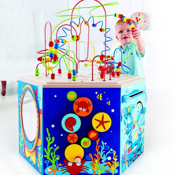 Centru de activitati ocean are o selectie extinsa de jucarii in jurul cubului pentru a tine copiii ocupati in zonele aglomerate ale holului si salile de asteptare. Laturile hexagonale prezinta: panou cu creaturi marine, panoul de joc cu broscuta testoasa in Zig Zag, panou rotativ cu ochi googly, blocuri Hide and Seek cu o barca si un panou de peste, panou de rulare Bubble Gears, panou oglinda pentru casca de scufundari.